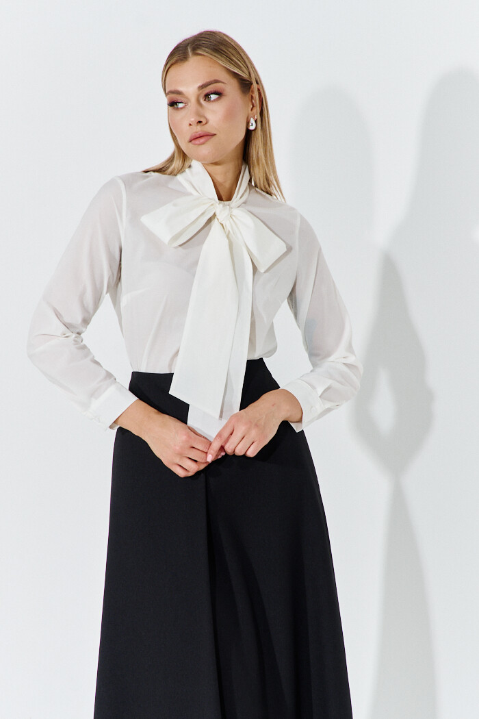 Блузка в стиле city chic выполнена из блузочного полотна с добавлением хлопка. Модель прямого силуэта с воротником-стойкой, переходящий в бант. Спереди предусмотрена потайная застежка на петли и пуговицы и сборкой по горловине.