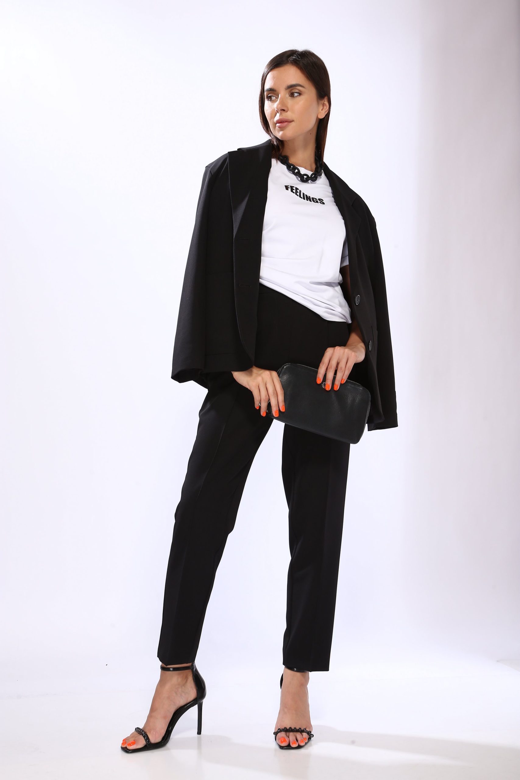 Костюм брючный. Стильный жакет прямого кроя, на подкладке. Линия плеча слегка спущена, рукав прямой, двухшовный. На левом рукаве настрочена декоративная бирка. Воротник стояче-отложной. По переду с двух сторон крупные накладные карманы. Застежка жакета на двух пуговицах, жакет смотрится очень стильно и лаконично. Длина жакета по среднему шву спинки 68 см. Длина рукава от спущенного плеча 59 см. Брюки зауженного к низу силуэта, с застроченными кантами по переду. Пояс брюк частично на резинке, по поясу нашиты шлевки. По переду боковые наклонные карманы, имитация застежки-гульфика. Длина брюк по боковому шву с поясом 100 см. Ширина брюк по низу 18 см. (в полуобхвате)