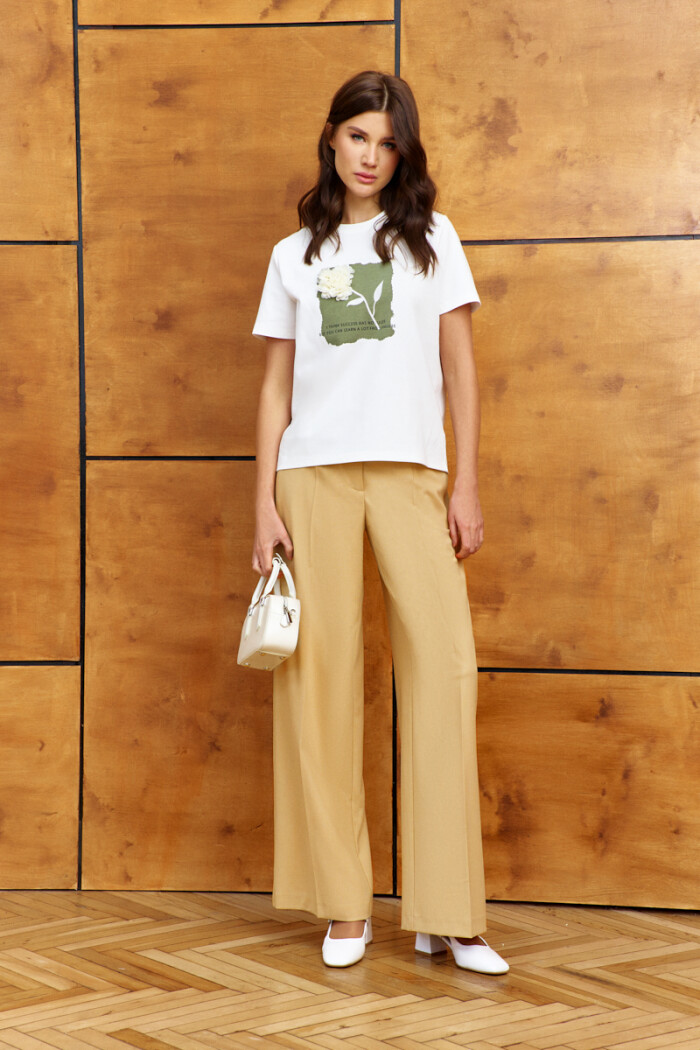 Джемпер выполнен из хлопкового трикотажного полотна высокого качества, обладающего рядом положительных свойств: мягкость, эластичность и устойчивость к деформации. Модель свободного кроя, со спущенной линией плеча и коротким рукавом. Горловина обработана узкой бейкой, а по спинке усилена тесьмой с целью предотвращения ее деформации. Деталь переда декорирована авторской дизайнерской печатью. Длина по спинке 66 см; длина рукава (от горловины) 39,5 см.