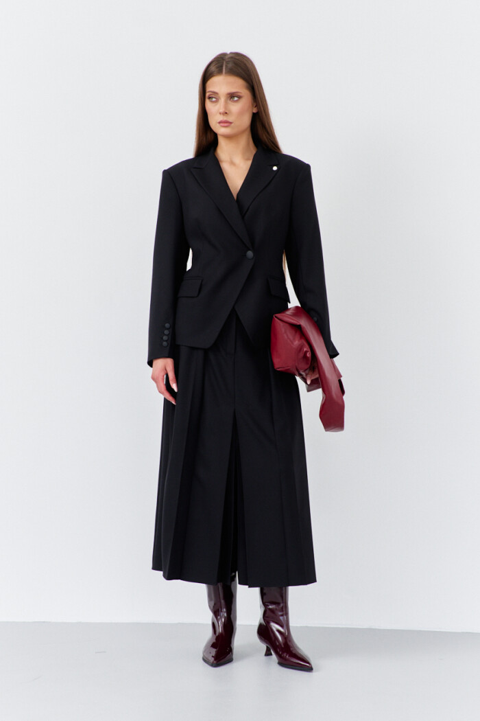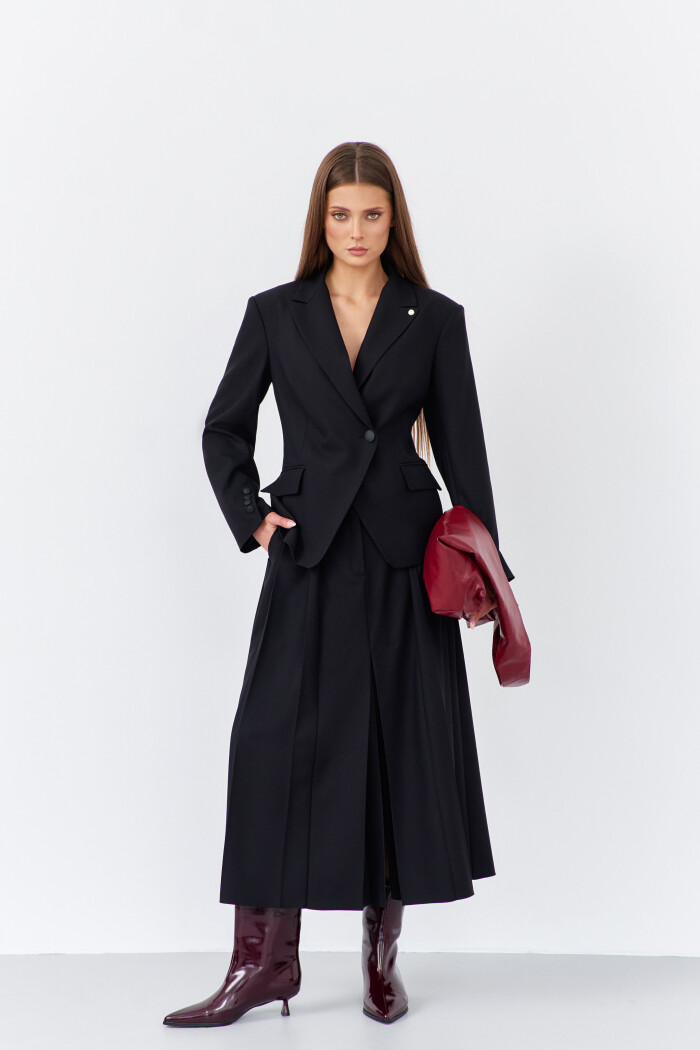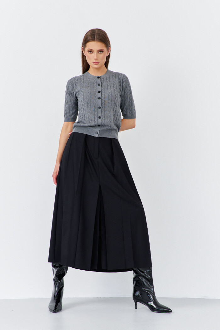 Элегантная юбка на подкладке, выполненная из костюмного полотна. Модель с комфортной средней посадкой на притачном поясе с эластичной тесьмой по спинке и заложенными глубокими складками, переходящими в широкую декоративную шлевку. Спереди предусмотрены косые боковые карманы и застёжка на тесьму “молнию” с потайным брючным крючком. Длина изделия 89 см.