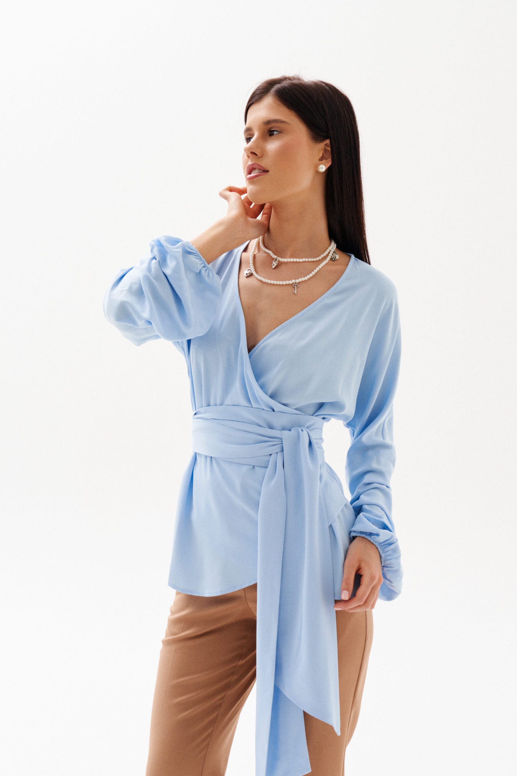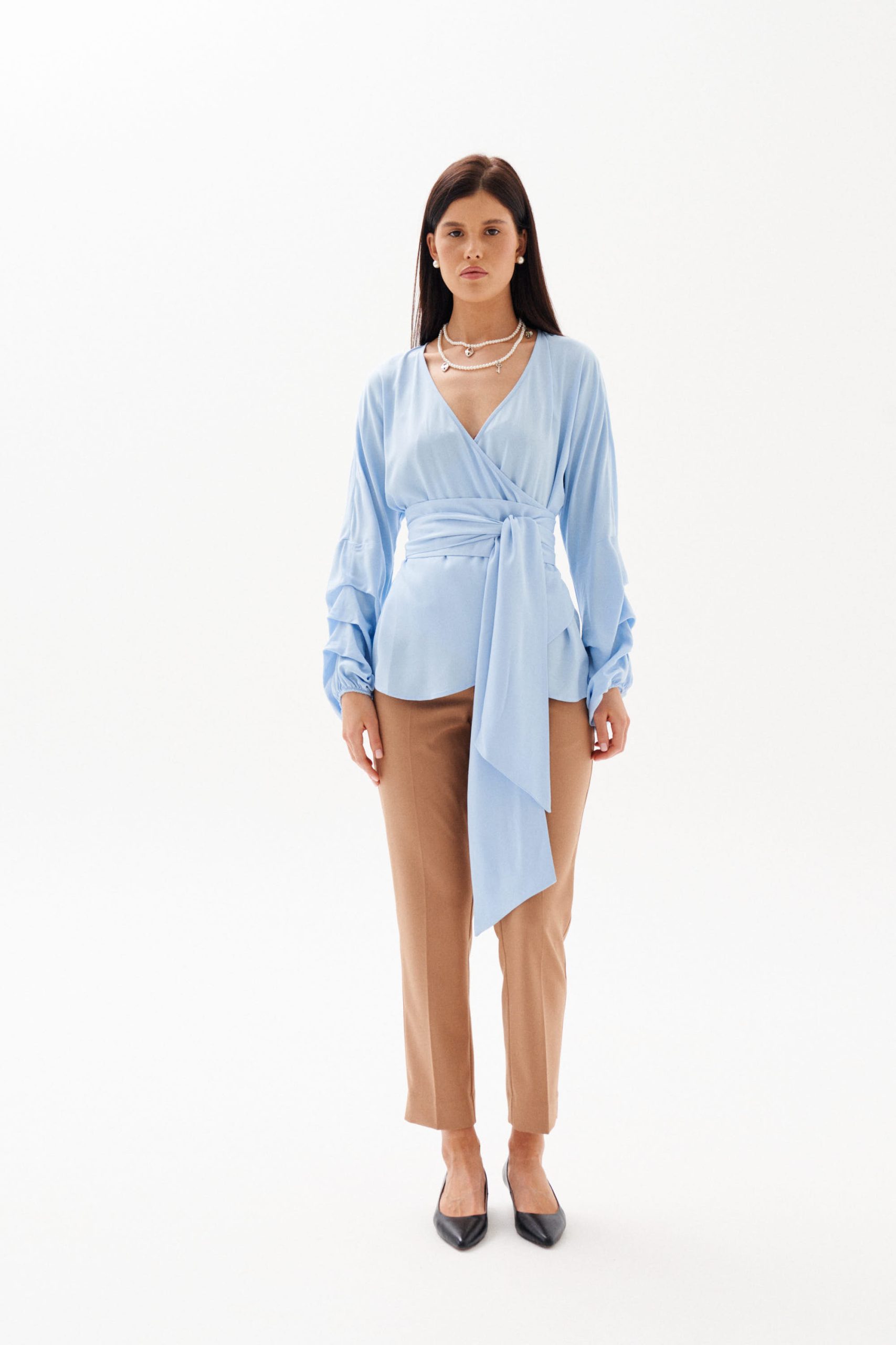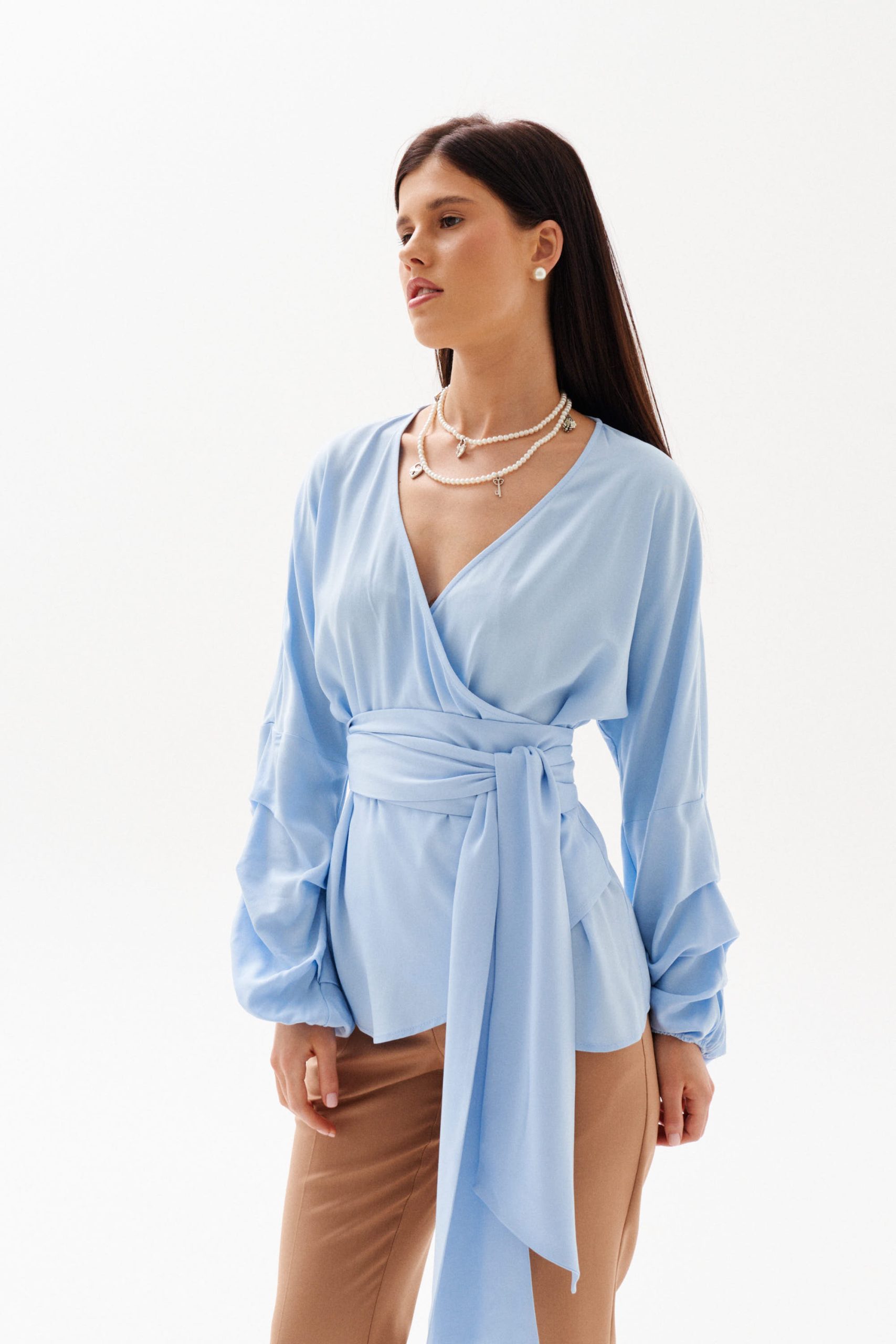 Линия плеча спущена,низ рукава имеет фантазийную форму со складками и собран на резинку по низу.