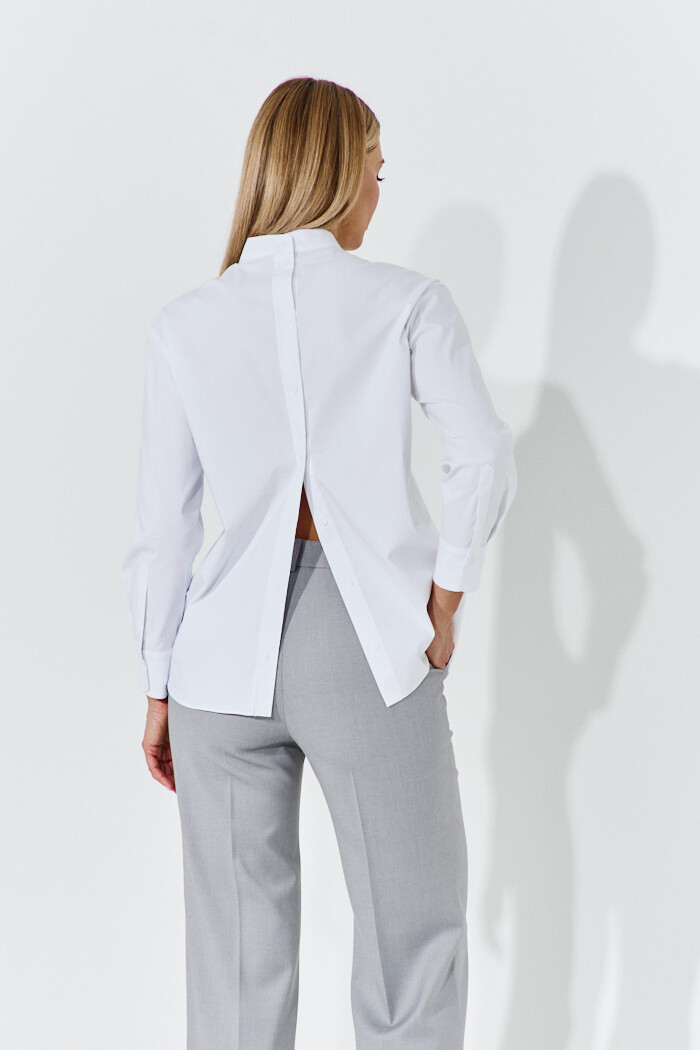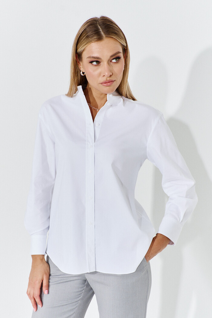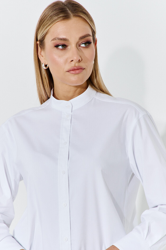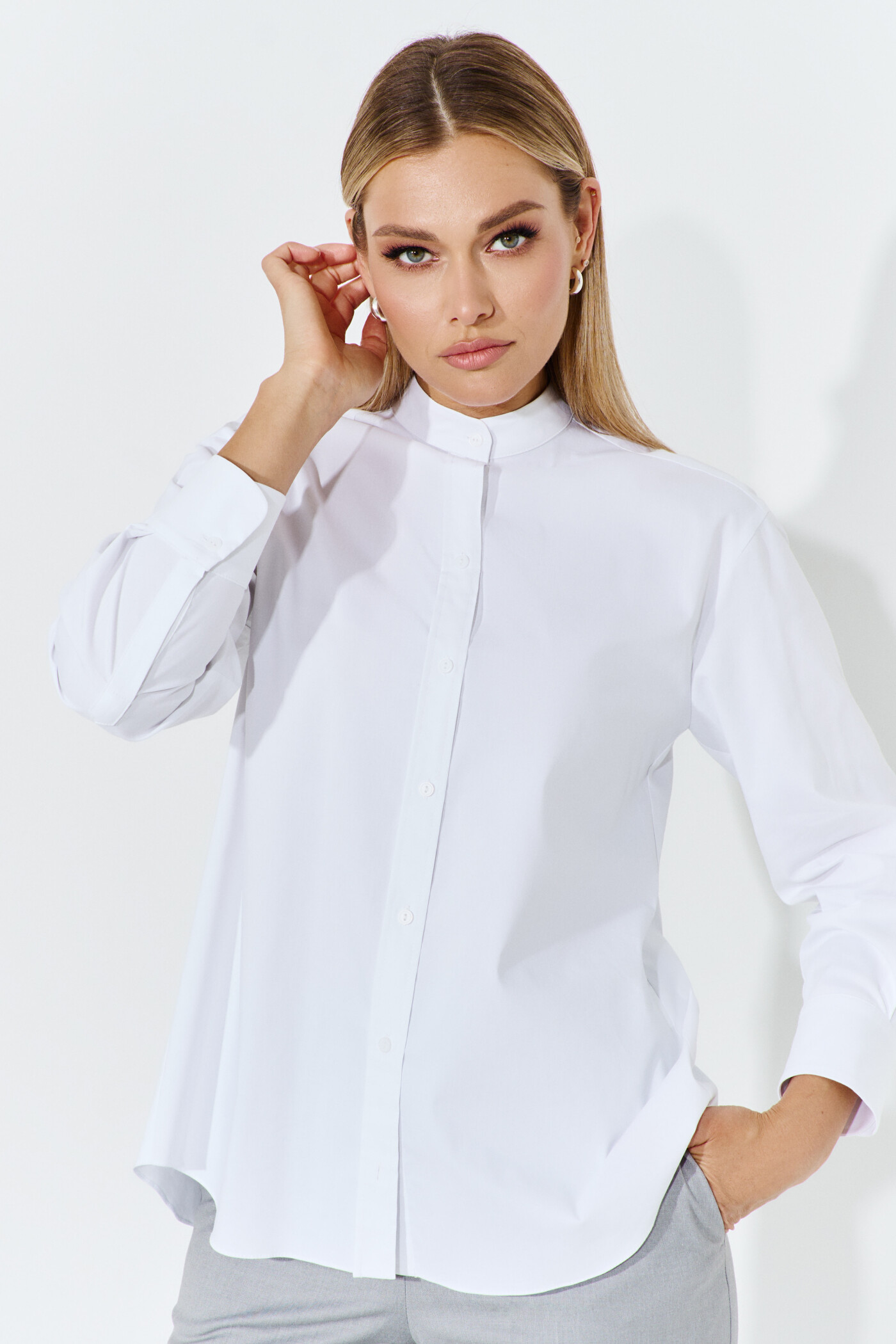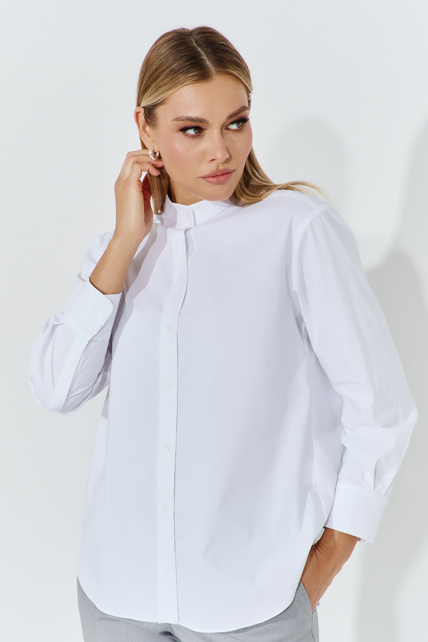 Блузка в стиле smart casual выполнена из хлопкового полотна. Модель прямого силуэта со спущенной линией плеча и закруглённым низом. Воротник-стойка. Особым декоративным элементом является планка на петли пуговицы по переду и спинке.