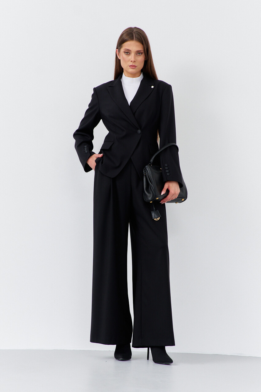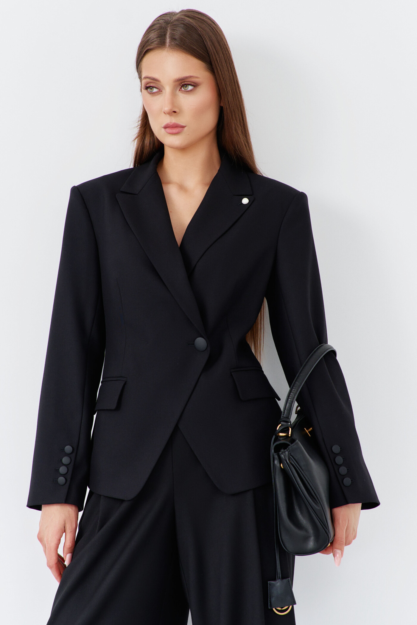 Двубортный классический жакет на подкладке, выполненный из костюмного полотна. Модель полуприлегающего силуэта с лацканами «ласточкино крыло» и со смещенной бортовой застежкой. Левый лацкан с петлей и декоративной пуговицей. Для удобства в носке спереди предусмотрены прорезные карманы с клапаном. Особым декоративным элементом являются длинные двухшовные рукава со шлицей в переднем шве на петли и декоративные пуговицы. Длина по спинке 61 см; длина рукава 59 см.