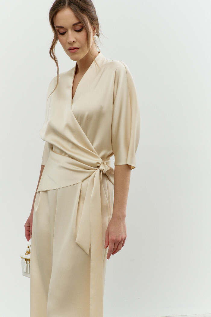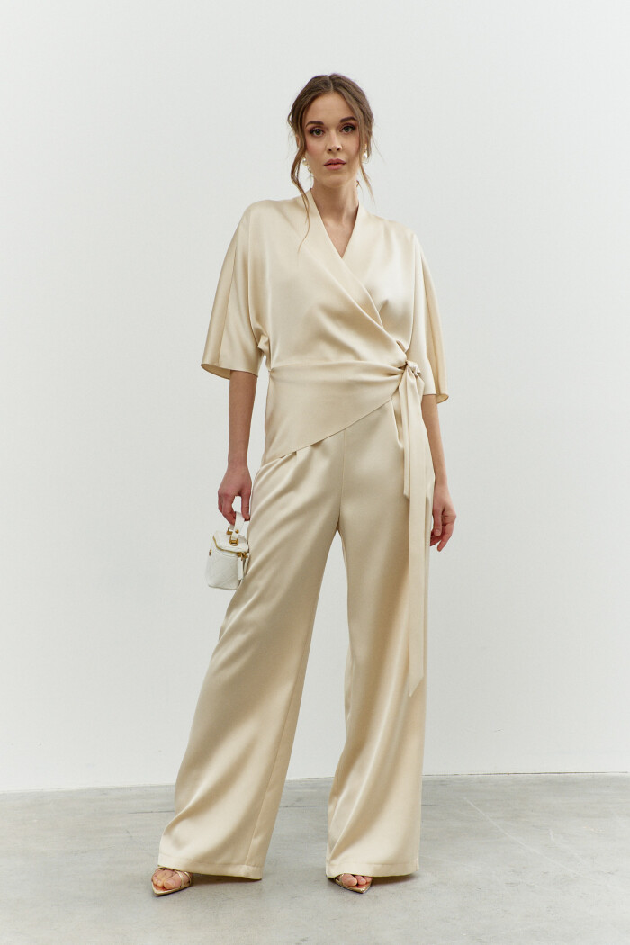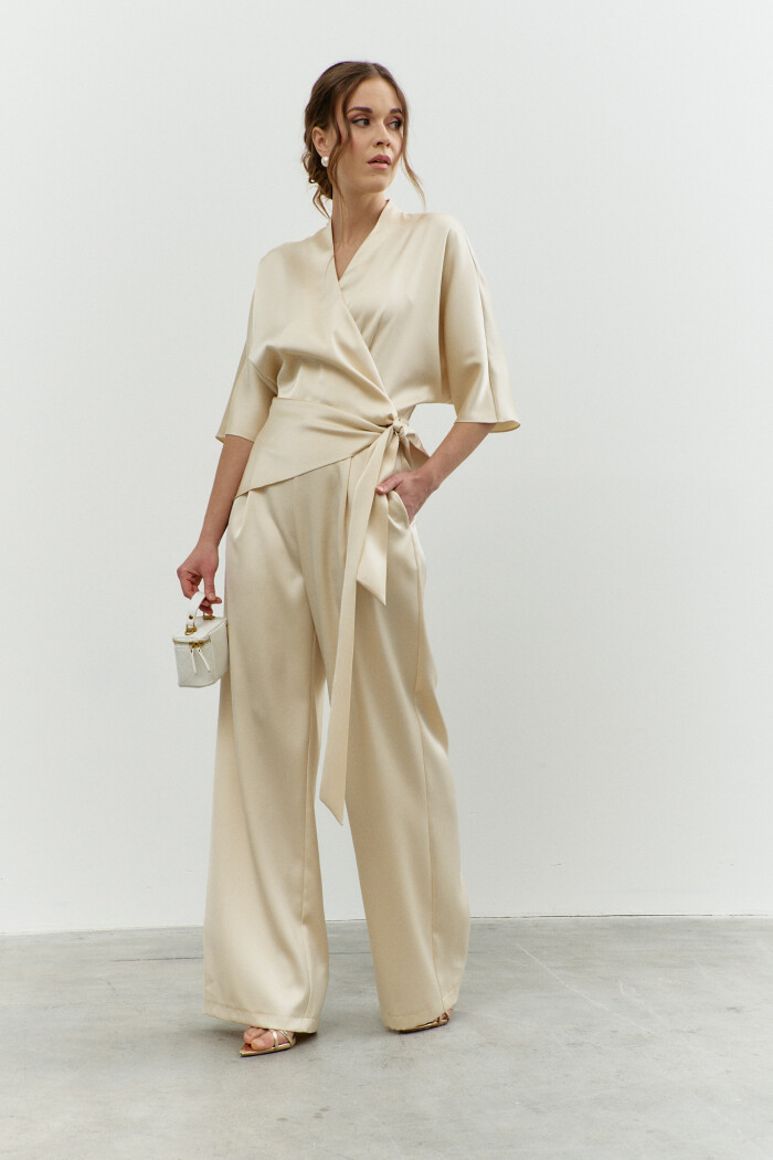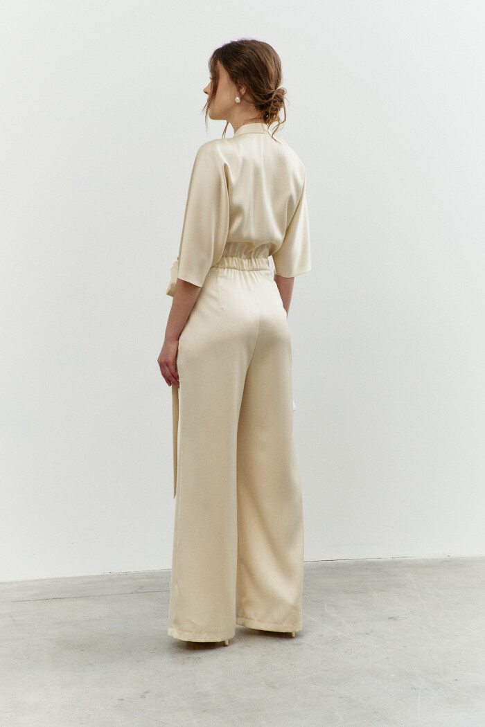 Элегантный комбинезон в стиле City Chic выполнен из сатинового полотна с благородным блеском. Модель полуприлегающего силуэта с отрезным поясом по линии талии; для удобства в носке по спинке предусмотрена эластичная тесьма между слоями. V-образная горловина на запах и переходящая на спинку в цельнокроеный воротник-стойка. На передних частях половин брюк заложены односторонние складки. Для удобства в носке спереди предусмотрены косые карманы и в правом боковом шве застёжка на тесьму «молния». Особым декоративным элементом является отлетная фигурная баска с правой стороны, скреплённая по линии талии с деталью переда и имеющая на краю фигурное отверстие для фиксирования через него отлетного длинного пояса, настроченного на левый боковой шов. Рукава цельнокроеные длиной ¾. Длина спинки — 43 см; длина брюк по боковому шву — 115 см; длина рукава (от горловины)— 51 см.