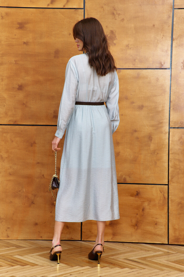 Элегантное платье выполнено из платьево-блузочный полотна. Модель полуприлегающего силуэта, отрезное по линии талии с расширенной к низу юбкой. Воротник-стойка. Спереди предусмотрена планка на петли и декоративные пуговицы. В боковых швах выполнены функциональные карманы. В качестве декора на планку правой части переда настрочен и частично зафиксирован отделочный элемент в виде отлетной планки. Рукава втачные длинные со складками вдоль застёгивающейся манжеты. Нижняя часть платья на подкладке из основного полотна. Длина изделия 130 см, длина рукава 56 см.