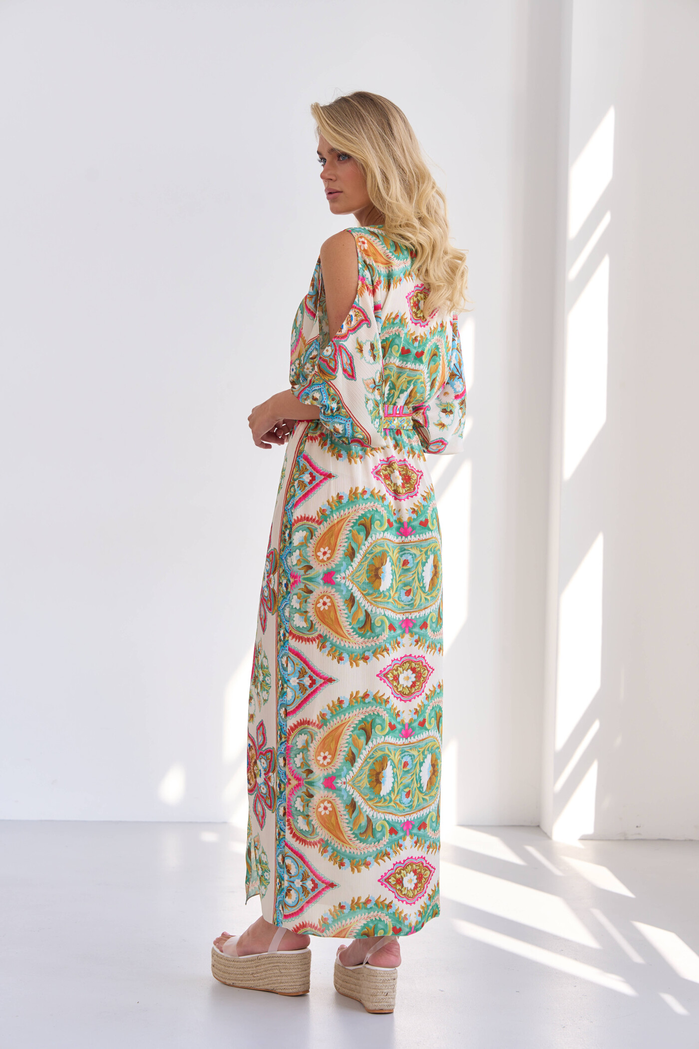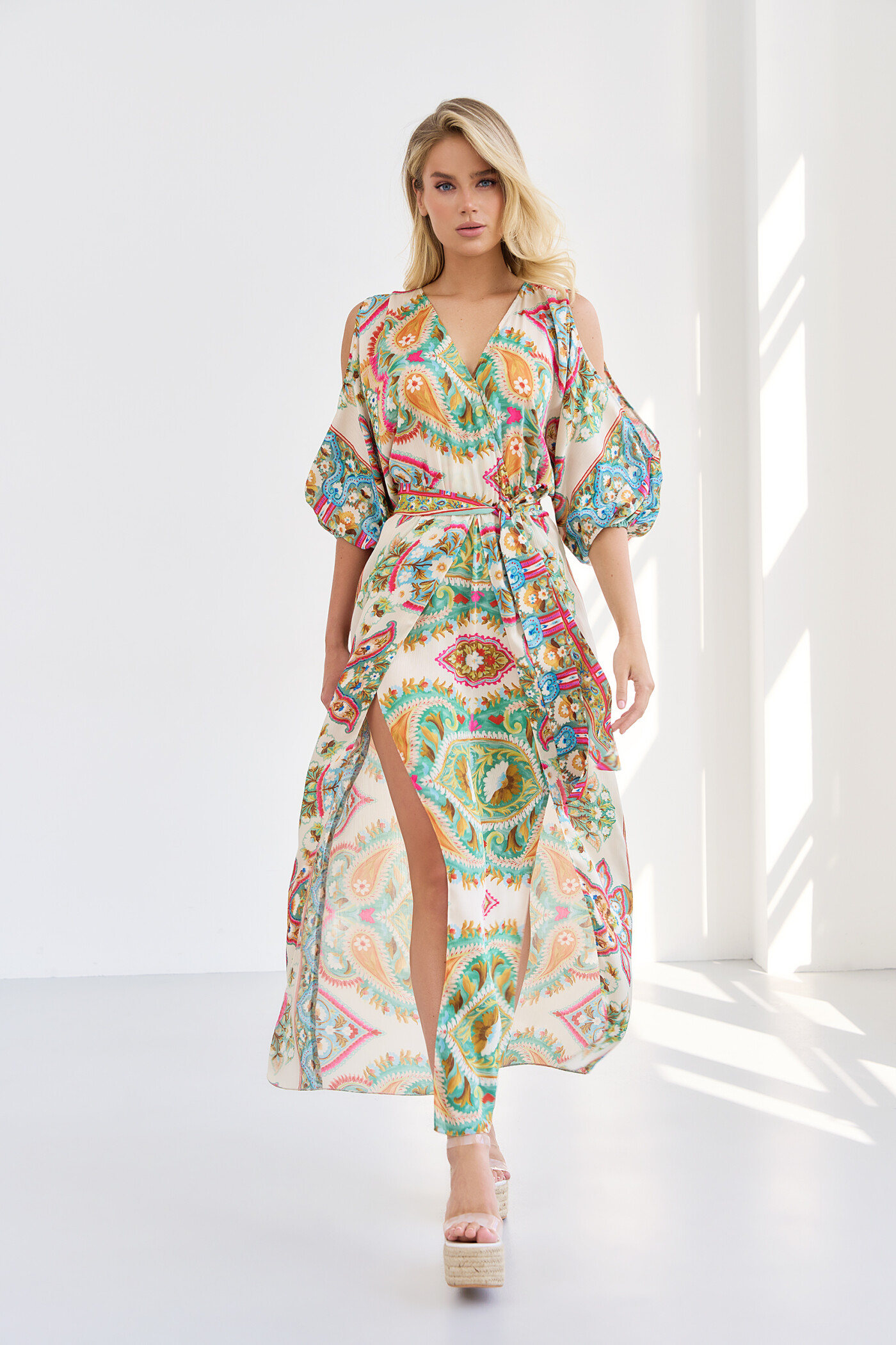 Платье в стиле city chic выполнено из крэш-сатинового французского полотна с эффектом «non iron» (не требующая утюжки). Модель полуприлегающего силуэта с V-образным вырезом горловины на запах. Отрезное по линии талии, в шве соединения лифа и юбки эластичная тесьма. По переду юбки высокие разрезы от талии на запах.